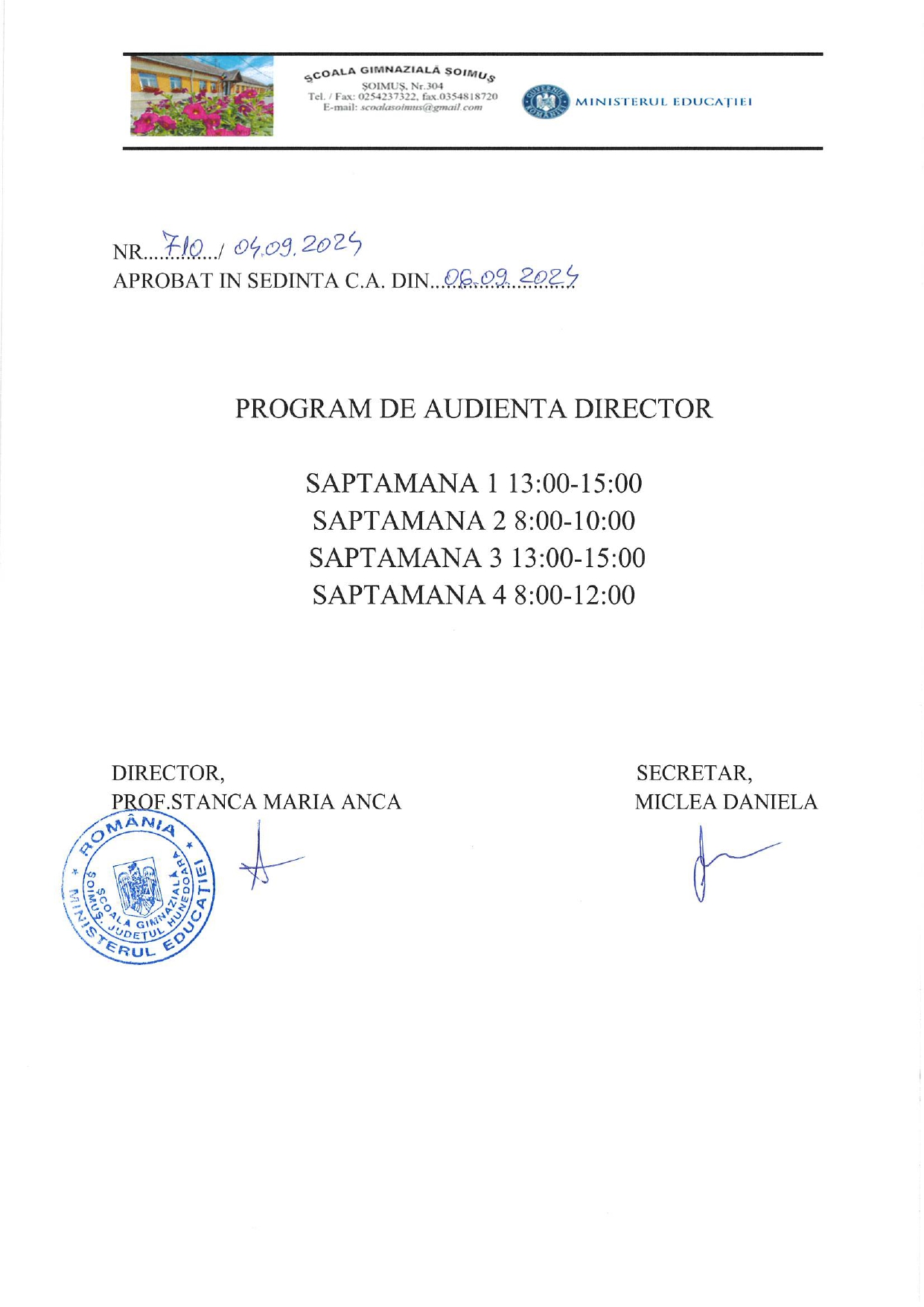 scoala soimus Posted on septembrie 6, 2024 CLICK AICI entru DETALII DOCUMENT PDF Program audiențe director Școala Gimnazială Șoimuș